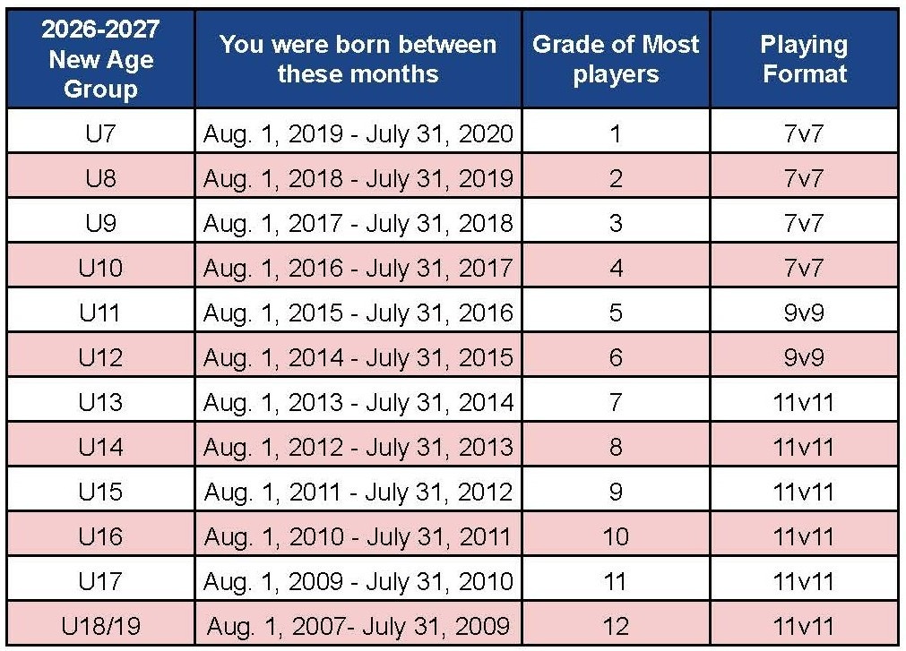 Beginning with the 2026-27 season, US Soccer has announced that US Club Soccer and US Youth Soccer will return to an August 1-July 31 age group cutoff. This will replace the January 1-December 31 birth year system that has been in place since 2017.