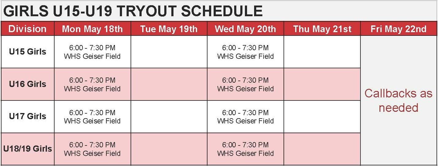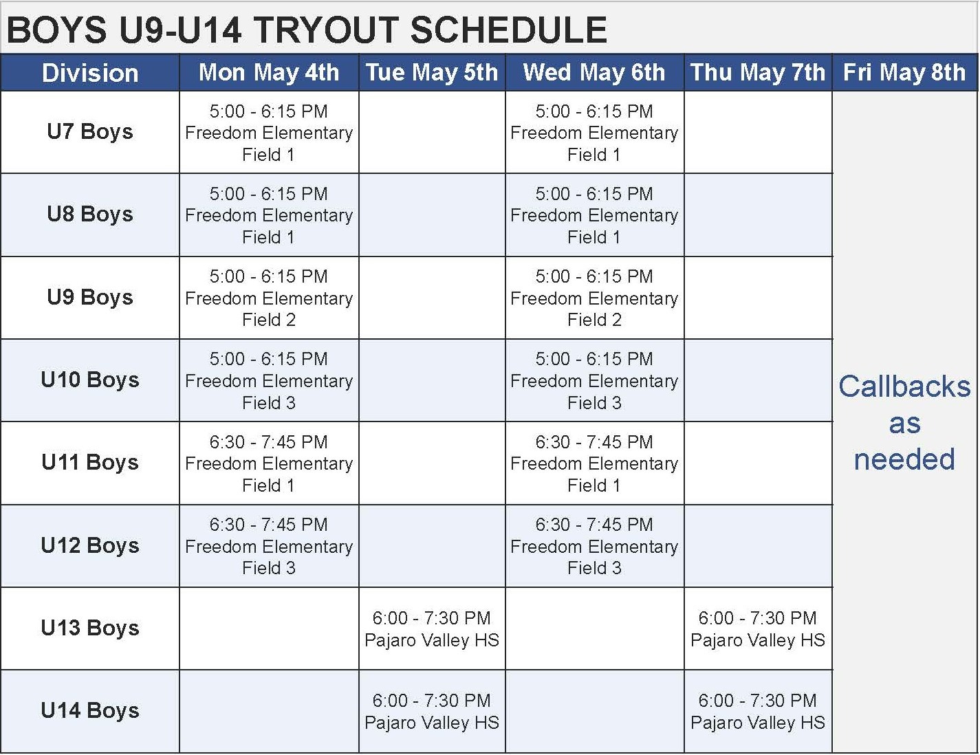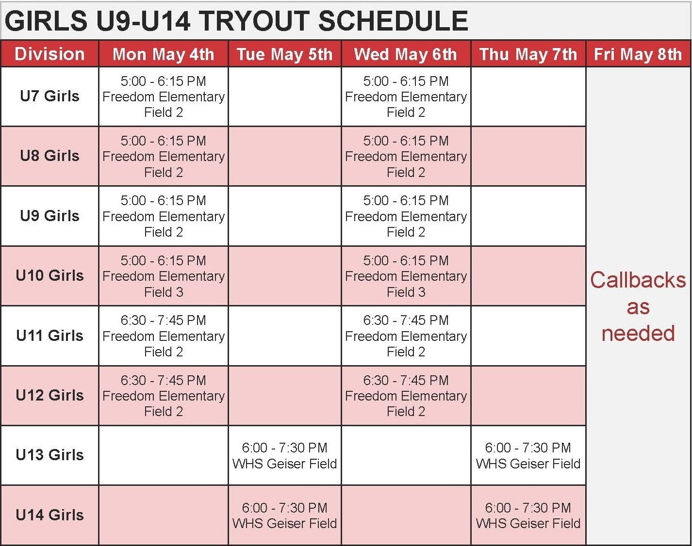 Tryout schedule for the U8 – U14: May 3 – June 28